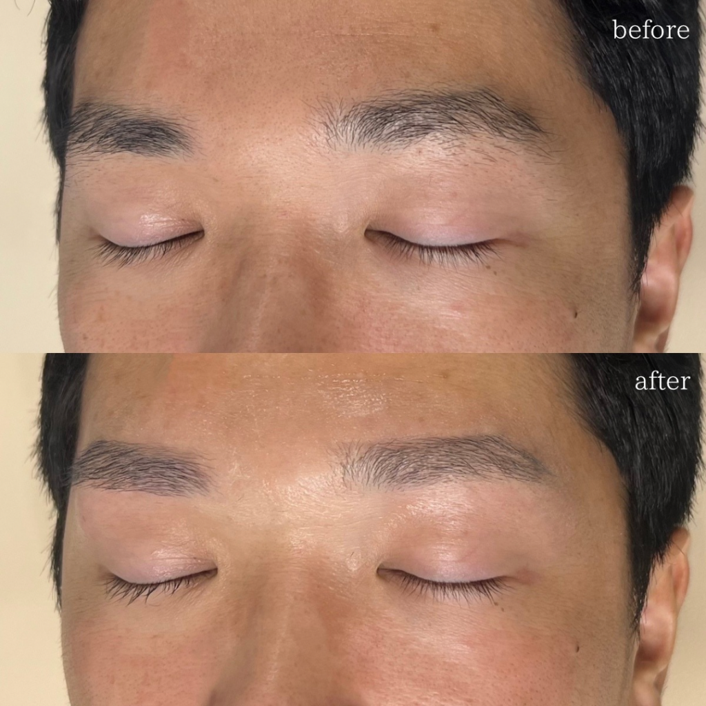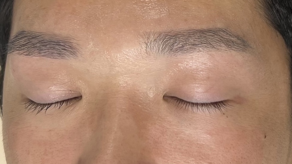 ・ワックス脱毛で眉周りの不必要な産毛をしっかり取っていく。男性によく似合う直線的なアウトラインが浮き立つよう目立ち、キリッとした印象に見える。