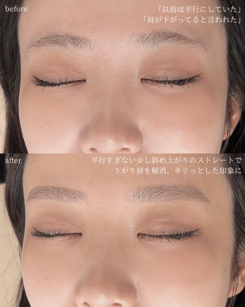 「しっかり平行」な眉も素敵ですが、お客様の骨格や表情によっては下がり眉に見えやすくなる場合もあります。