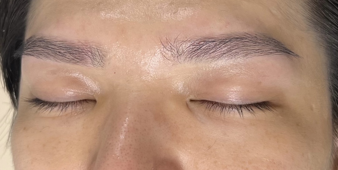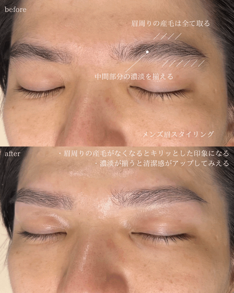 ・ワックス脱毛で眉周りの不必要な産毛をしっかり取っていく。男性によく似合う直線的なアウトラインが浮き立つよう目立ち、キリッとした印象に見える。